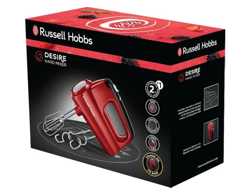 Russell Hobbs Batteur [Facile & puissant] Desire Rouge (5 vitesses+fonction turbo, 2 fouets et crochets pétrin compatibles lave-vaisselle, bouton d’éjection, position de rangement verticale) 24670-56